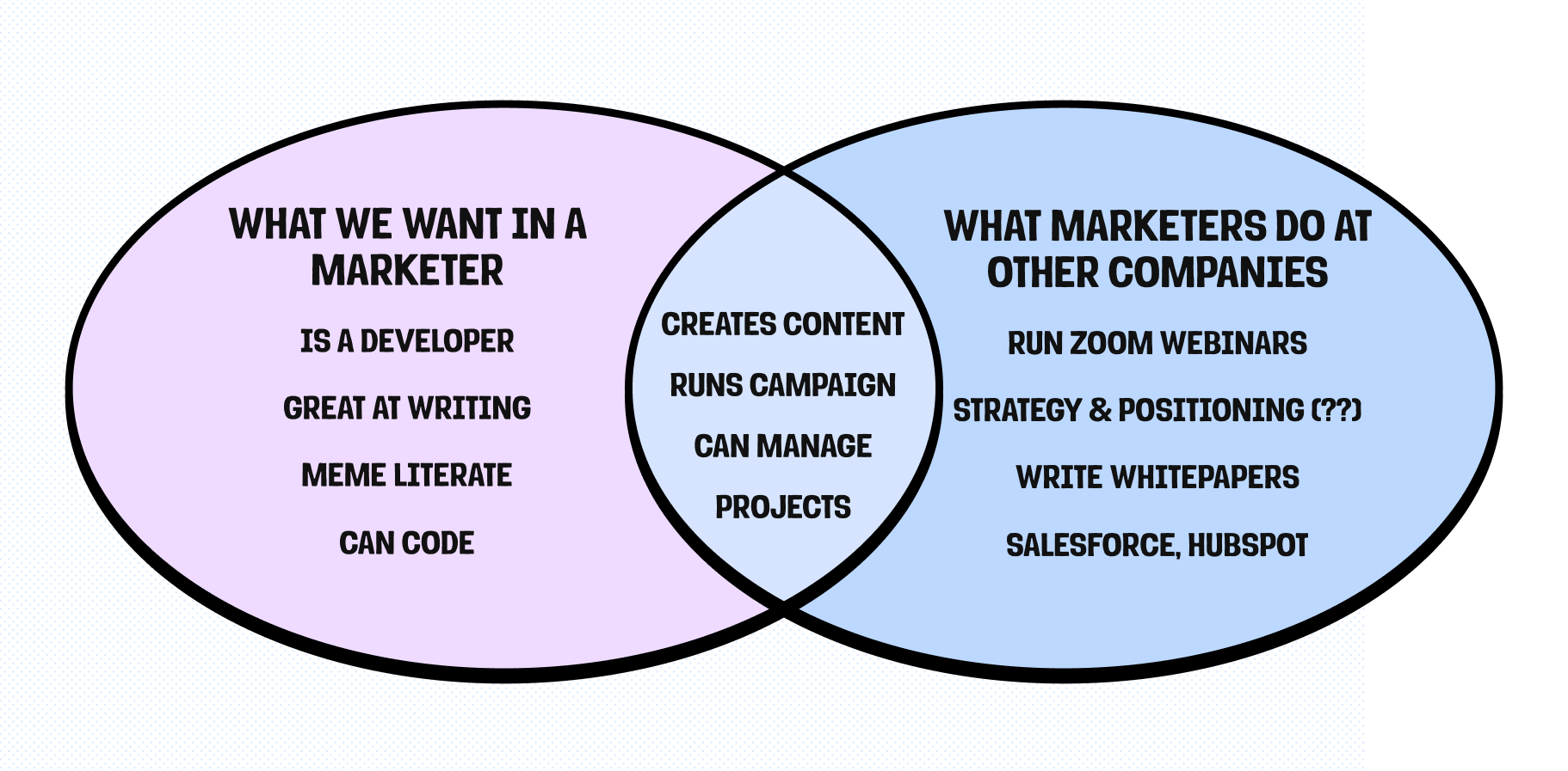For months, we had trouble hiring a product marketer. We got hundreds of applications from people who had been product marketers at other companies, but their experience was a bit too corporate for us.