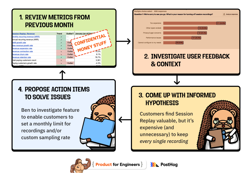 Product managers at PostHog track and ensure success3 by running growth reviews: monthly meetings where they go over revenue trends, user feedback, usage metrics, and quarterly goals with the engineers building the product.