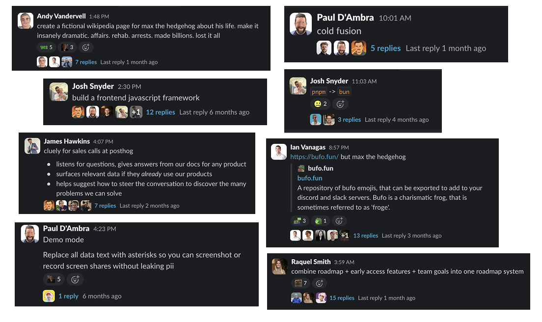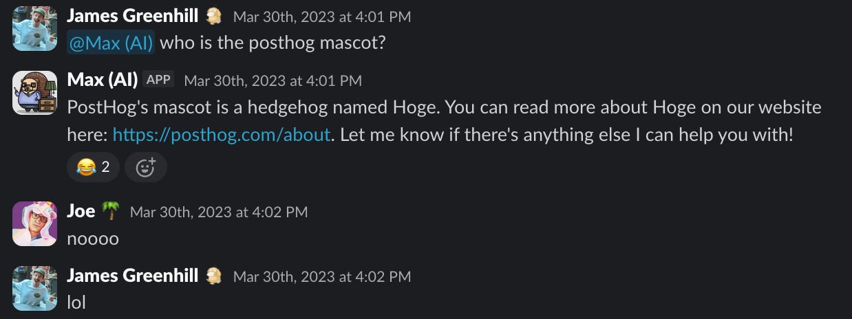 It’s a perk and cultural cornerstone. The hackathons show we value autonomy and give people the time to make the most of it. It also creates lore, like the time our AI chatbot was insistent PostHog’s mascot was a character named “Hoge.”