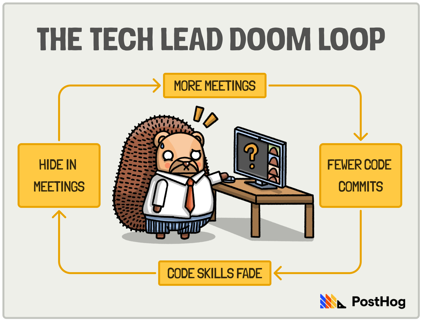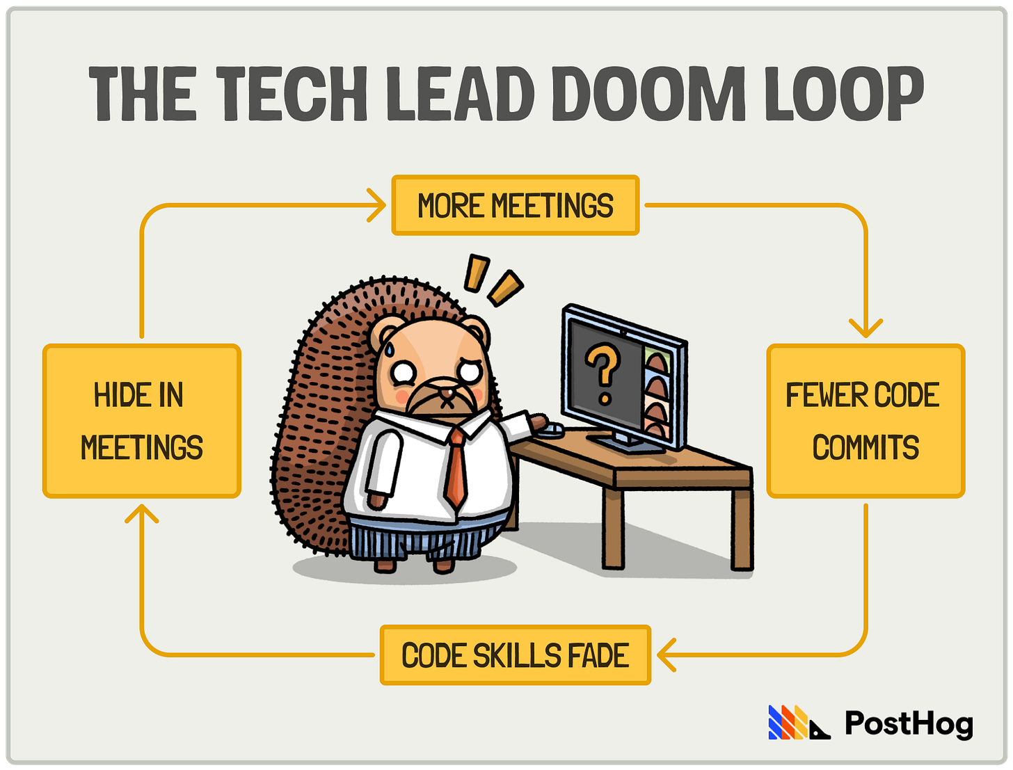 Before you know it, you're stuck in a doom loop: more meetings → fewer commits → coding skills fade → you hide in meetings → repeat.