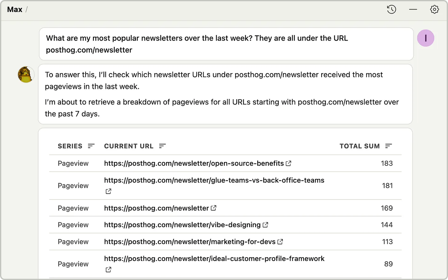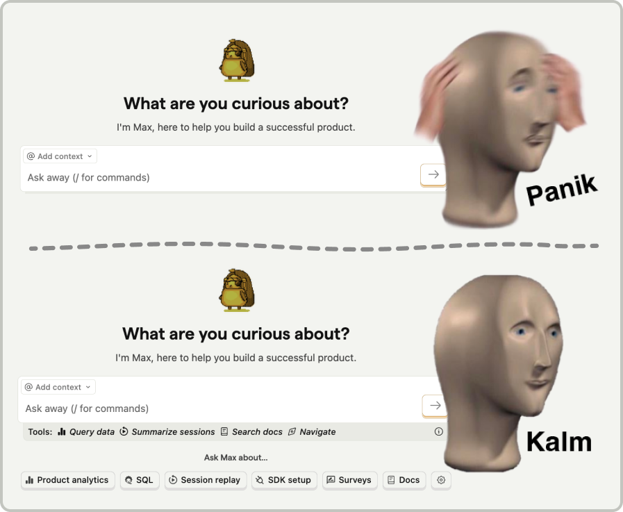 When building Max, we quickly realized answering questions like “How do I increase revenue?” were too broad. Instead, we focused on building specific functionality that leverages its advantage of being integrated into PostHog with your PostHog context.